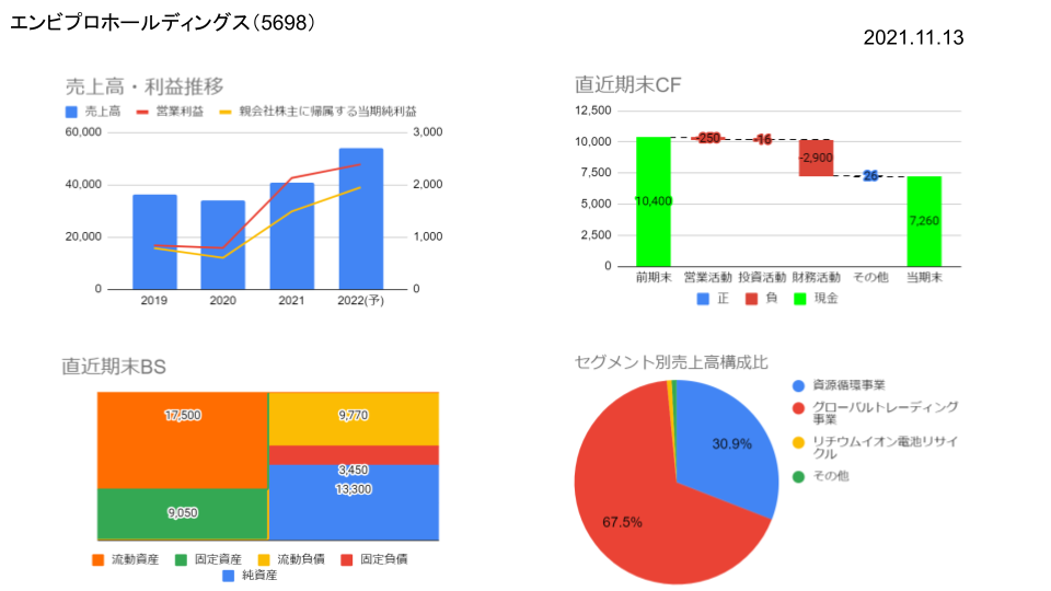 今回、この銘柄を見つけるきっかけになったリチウムイオン電池リサイクル事業では、赤字の状況。2021年度第4四半期から黒字化。今期第1四半期の資料を見ても順調に成長している様子です。
