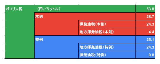 つまり当面の間、揮発油税では24.3円、地方揮発油税が0.8円がこの特別措置法により特例という形で増税されている状況になっています。まとめると次の図となります。