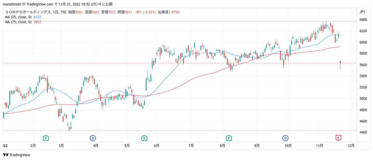 11月21日の東証プライム値下がり率第2位がSOMPOホールディングス(中核は損保ジャパン)でした。時価額が大きい企業ながら、前営業日比▲8.0%の下落となりました。